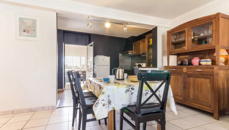 A recently-renovated flat on the first floor of a shop in the town centre, 100m from the river Erdre and Nantes-Brest Canal, beside a road which is busy during rush hours. Public car park 5m. Separate entrance up steps. Large, east-facing, private patio (153 sq.m.), not overlooked. Lounge-diner and open-plan kitchen. Veranda. 3 steps up to bedrooms. Bedroom 1: king-size bed. Bedroom 2: king-size bed. Bedroom 3: 2 single beds (80cm). Bathroom with WC. Additional facilities: WiFi, sound tower, tumble dryer, baby equipment. Price includes gas heating, electricity and bed linen. Extra charge for towels.