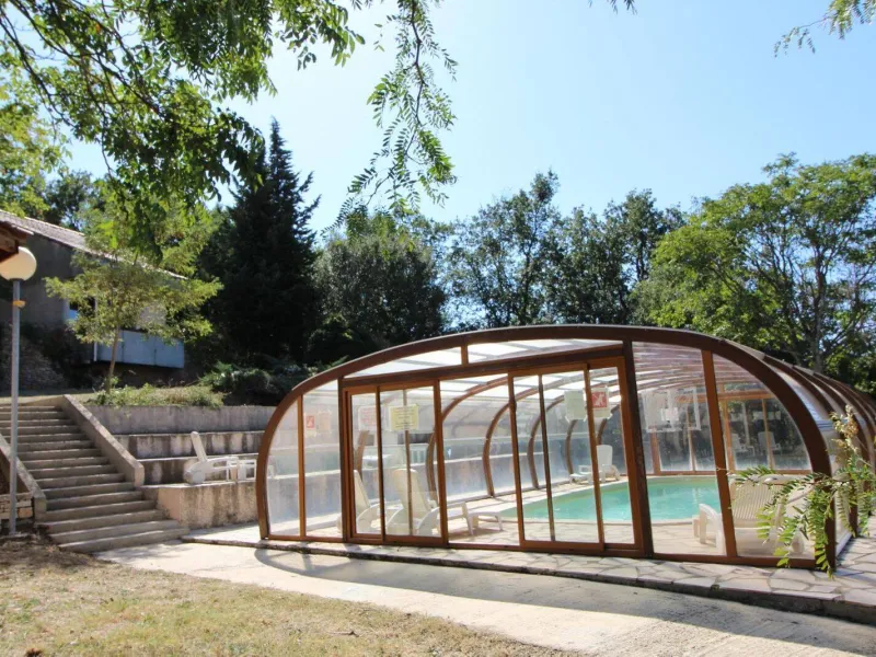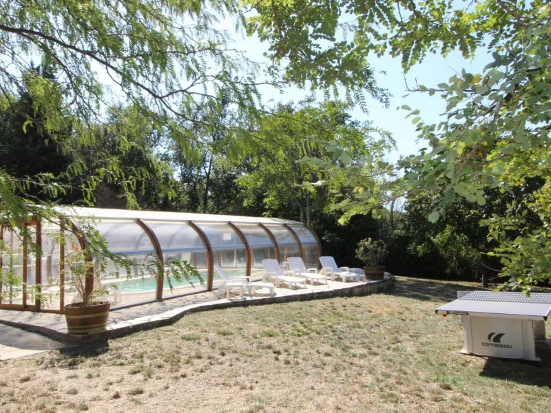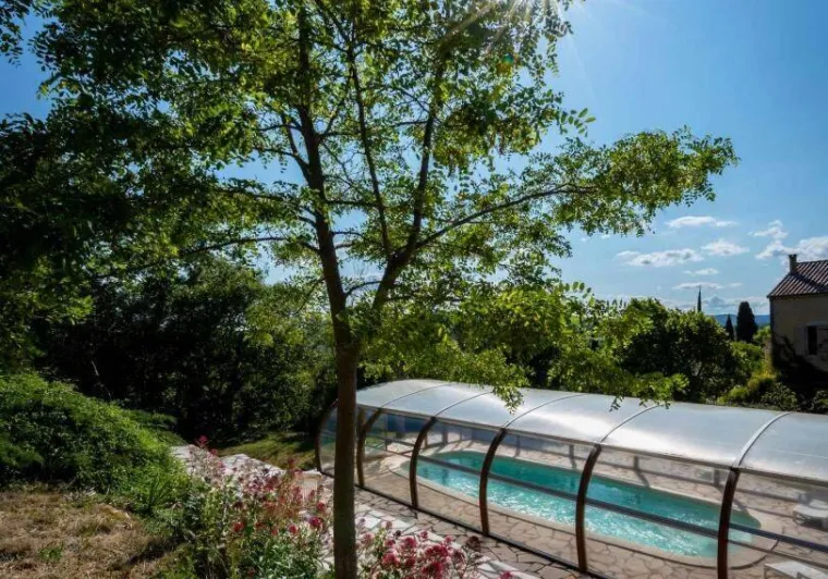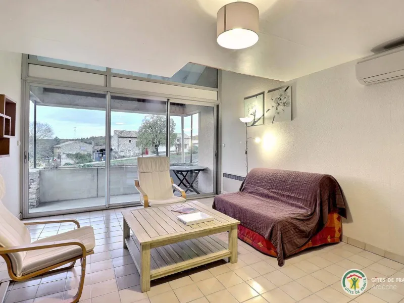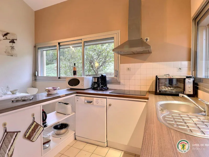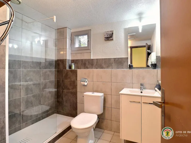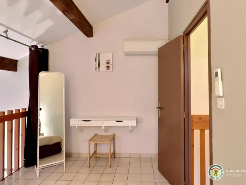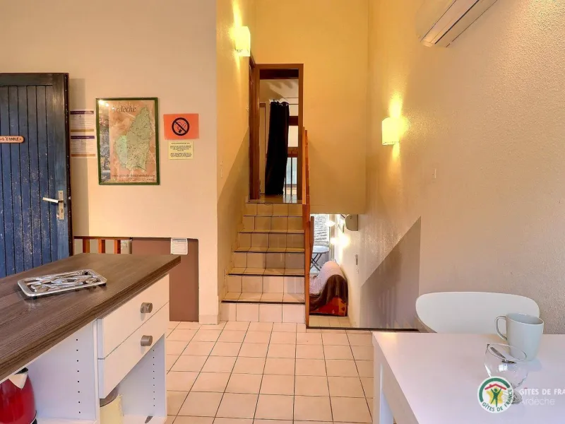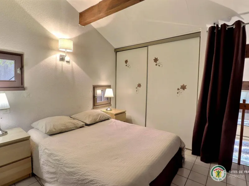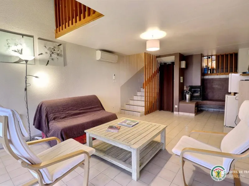 Living room (double sofa bed, wall-hung flat screen TV, inset fireplace - free firewood), kitchen, mezzanine (double bed), bathroom/WC. Cot, high chair on request. Electric heating. TV point. Terrace, balcony, shared garden. Large shops 11km. Warm/cool air system. Covered swimming pool (4x9m) shared by 5 gîtes. Gîtes are 100m from waymarked hiking trail and about 3km from GR (long distance footpath). Towel hire: 3€/week/small towel, 5€/week/large towel.