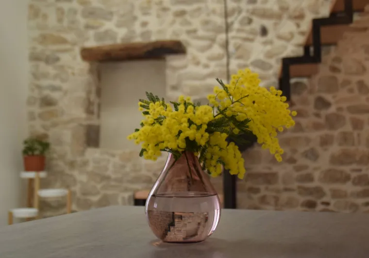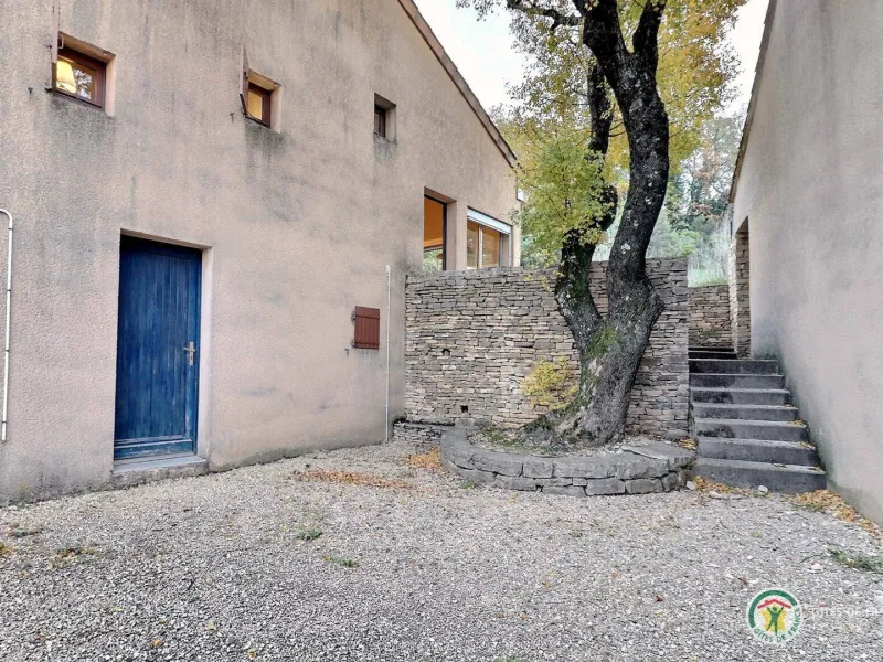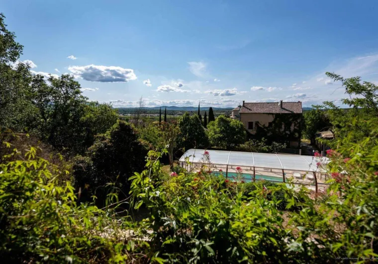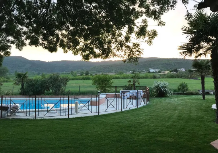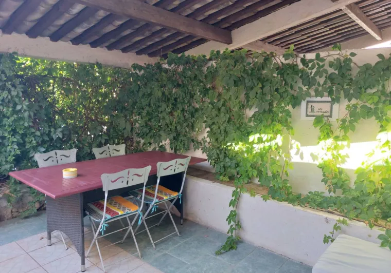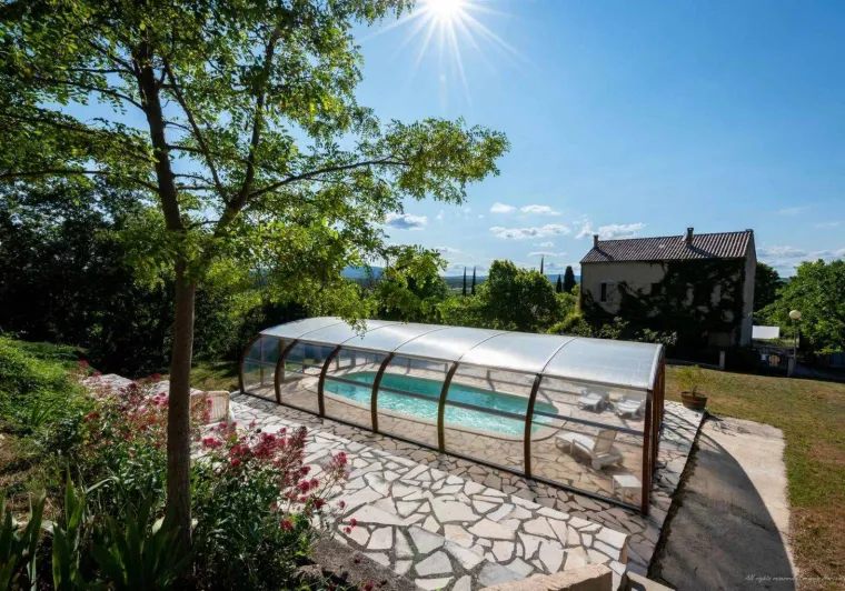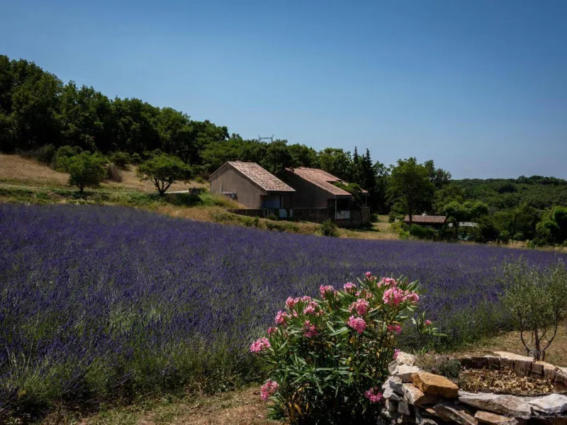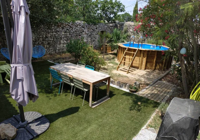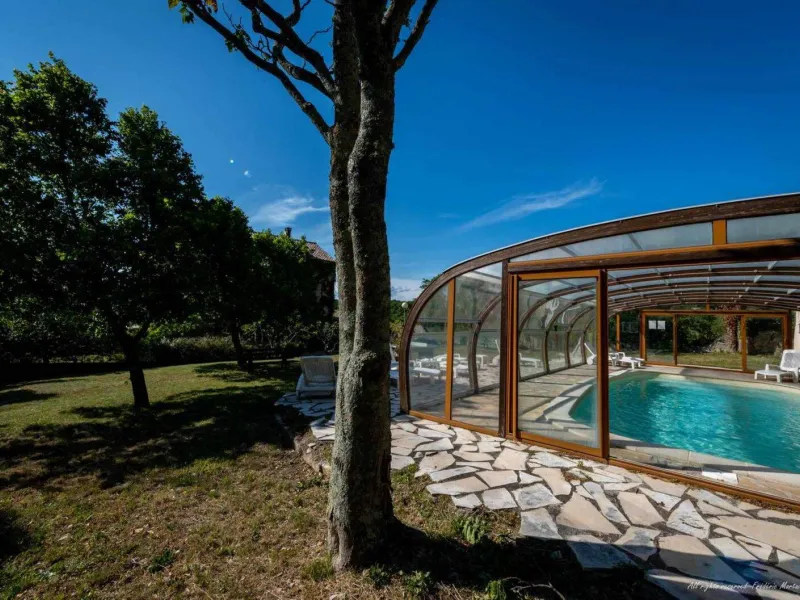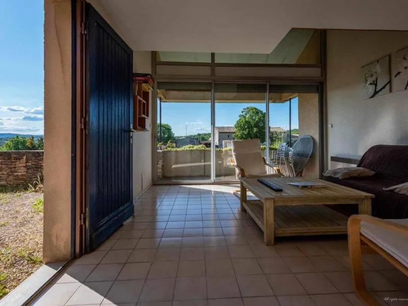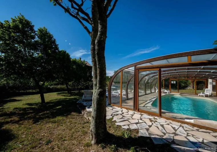 Living room (double sofa bed, wall-hung flat screen TV, inset fireplace - free firewood), kitchen, mezzanine (double bed), bathroom/WC. Cot, high chair on request. Electric heating. TV point. Terrace, balcony, shared garden. Large shops 11km. Warm/cool air system. Covered swimming pool (4x9m) shared by 5 gîtes. Gîtes are 100m from waymarked hiking trail and about 3km from GR (long distance footpath). Towel hire: 3€/week/small towel, 5€/week/large towel.