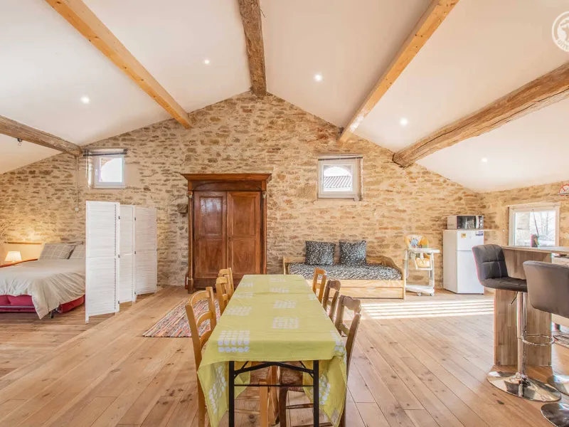 Fabienne, yoga teacher (personalized sessions on site possible on request) & Stéphane (sports & fitness enthusiast), open the doors of an authentic 19th century wine & agricultural outbuilding nestled on the edge of a small vineyard, at heart of a wine-growing village typical of the Mâcon countryside (home to a listed Romanesque church from the 12th century). Nestled at the foot of the famous Roche de Solutré, labeled "Grand Site de France" for its exceptional heritage and landscape riches (one of the largest prehistoric sites in Europe, rich in 50,000 years of human presence, offering a superb unobstructed view up to 'at Mont-Blanc!), Davayé has a hilly wine-growing setting, immersed in the heart of an immense preserved plateau of vineyards, close to several wild forest massifs. Sumptuous landscapes & panoramas to discover in the surrounding area. Large atypical "loft in the countryside" nestled under the roofs on the site of the old barn. Very nice volume. Warm country character with contemporary accents enhanced by careful heritage restoration (conservation of the rich traces of the original building: stone walls, stone & wood lintels, beams, original "bull's eye" windows adorned with bricks, etc.). Lots of charm & character. Cozy & cocooning atmosphere. Unusual & exotic. Pleasant & spacious “courtyard terrace” protected from view by the old surrounding wall of the property. Ping-pong & pétanque table possible on the courtyard side.Composition: Detached house adjoining the owners' home (total independence). Wifi (fiber). Heating by wood stove. Ground floor: laundry area. 1st floor: living room-kitchen-lounge on a large open plan (double bed 140x190cm + double sofa bed 140x190cm + 2 single pull-out beds 90x200cm as extra), bathroom (shower/WC). Terrace (gravel) + bicycle storage + private parking. Courtyard shared with owners. Supermarket 4 km. All amenities 6 km. Gite labeled “Accueil Vélo”