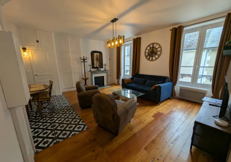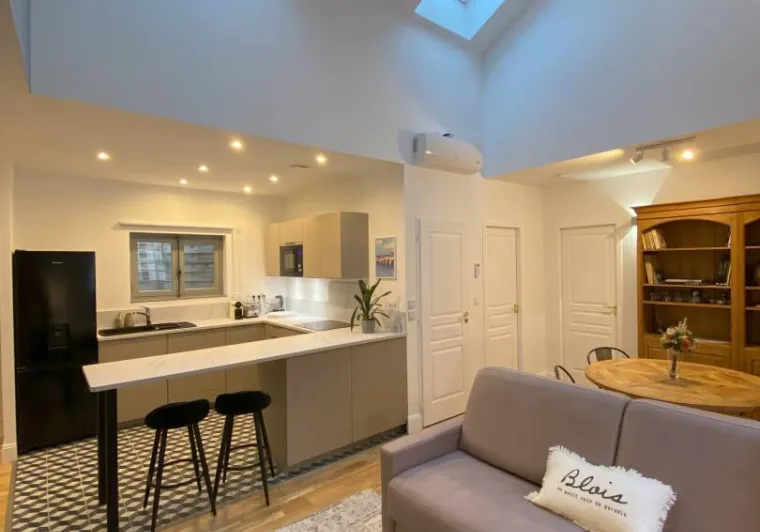 5 mins from the Loire bike routes, 3km from Blois, a bungalow with separate enclosed garden. Ground floor: living room with fitted kitchen area, lounge with cable TV. 1 bedroom with twin beds, 1 queen sized bed, shower room, toilet. Double sofabed in living room. Eco heating and solar panels. Option to rent sheets 8€ per bed. Cleaning on request at 35€. Towels 4€ per person. Private parking. Cot.Localisation
