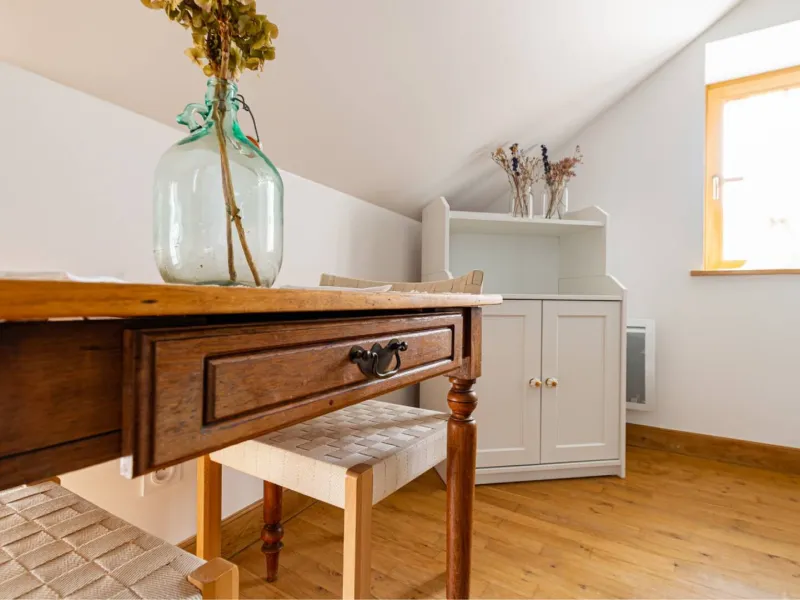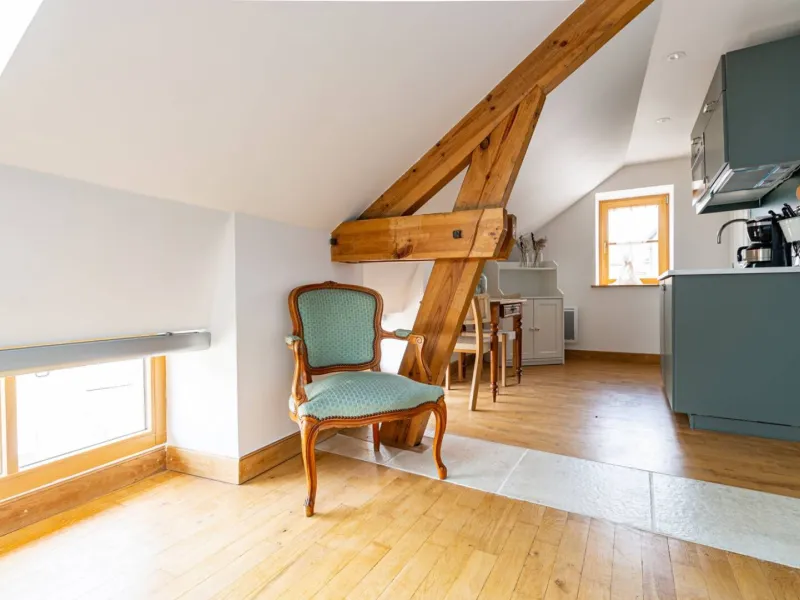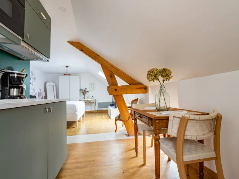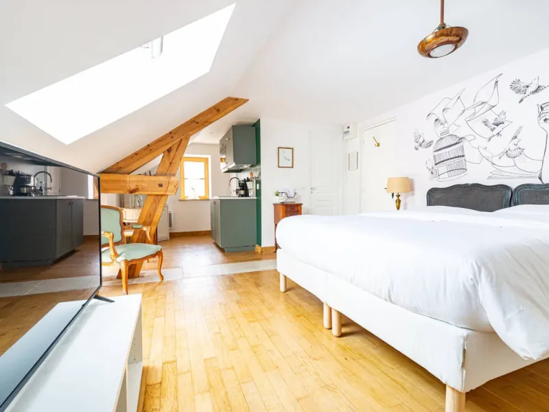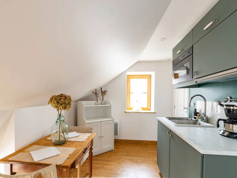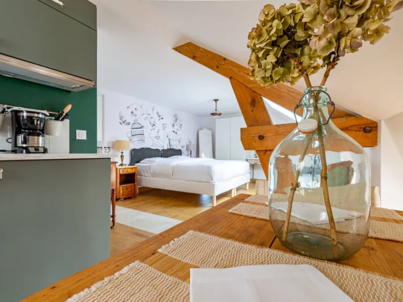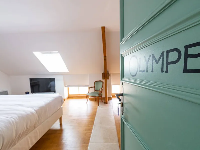 With a large double King size bed (or two separate single beds), a fully equipped kitchen and a bathroom with a large Italian shower, the OLYMPE is ideal for a romantic stay or with friends (separate beds). With its exposed beams and its beautiful views over the village, it benefits from a beautiful light, especially in the morning. On request, we can provide you with a cot, a lovely cot and/or a high chair for your baby free of charge. During your stay, if you require extra cleaning, please select the "extra cleaning" option at the time of booking. Upon arrival, we will schedule the day of your choice together. Breakfast and tapas are served in the bar of La Maison George. A take-away formula to be enjoyed in your room is possible on request! Ask at the bar directly on arrival.Localisation
