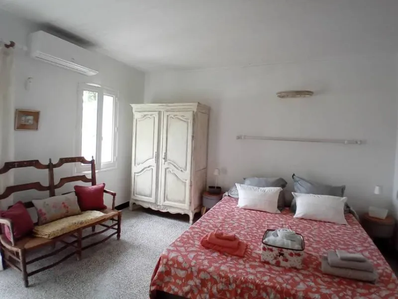 La belle chambre double de 16 m2 donnant sur le jardin arboré, est aménagée avec un lit en 160 et un lavabo.