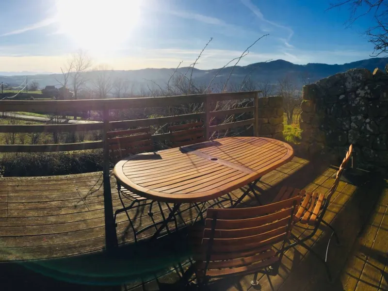 Terrasse en bois plein sud et accès à un petit espace en herbe ouverts tous deux sur la campagne et les montagnes.