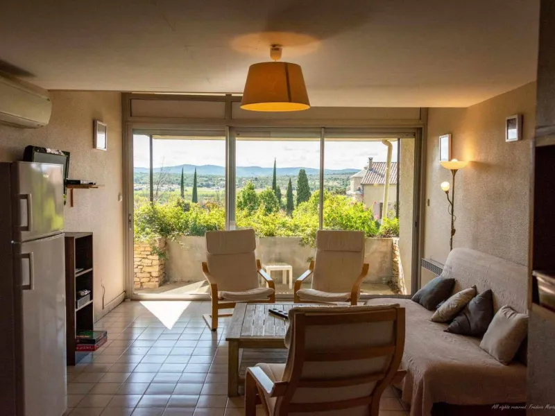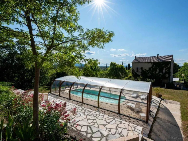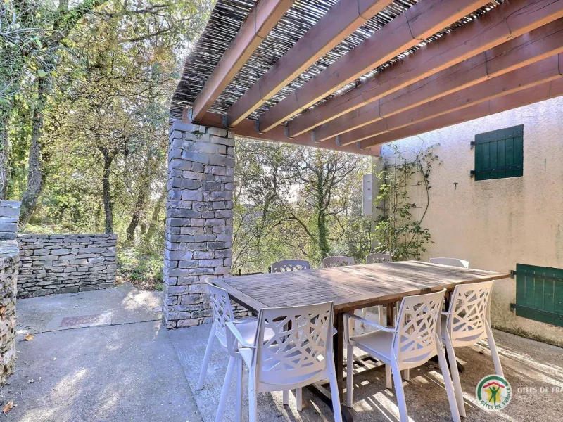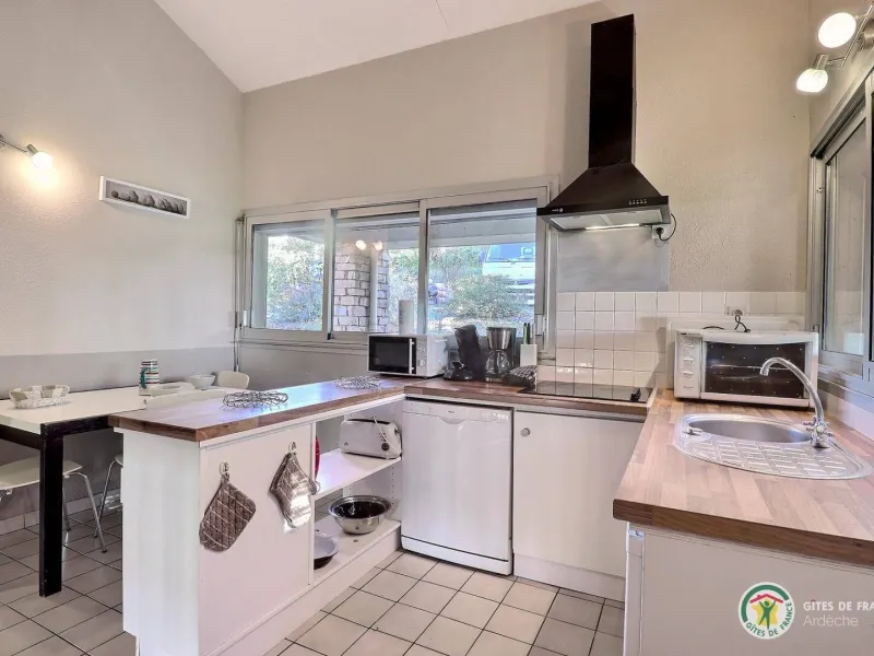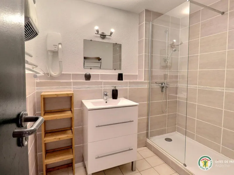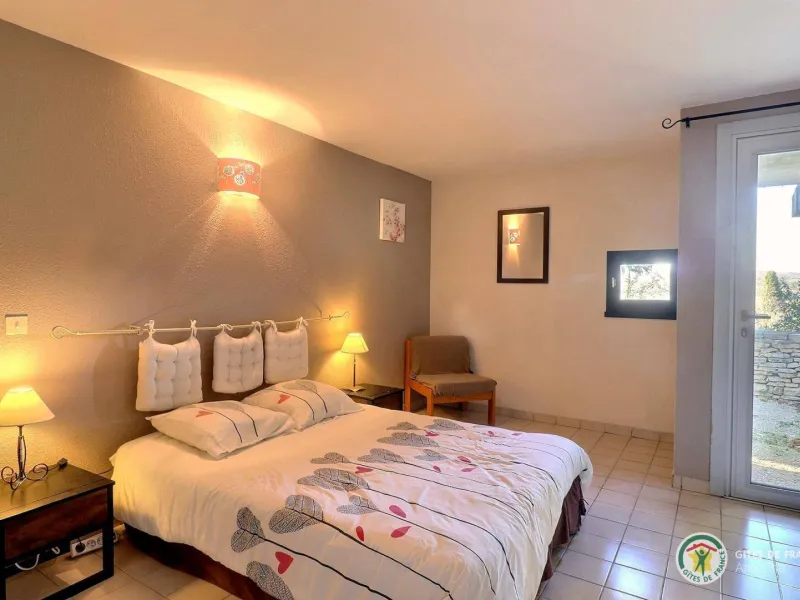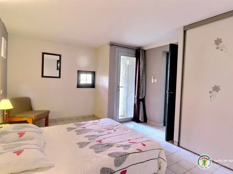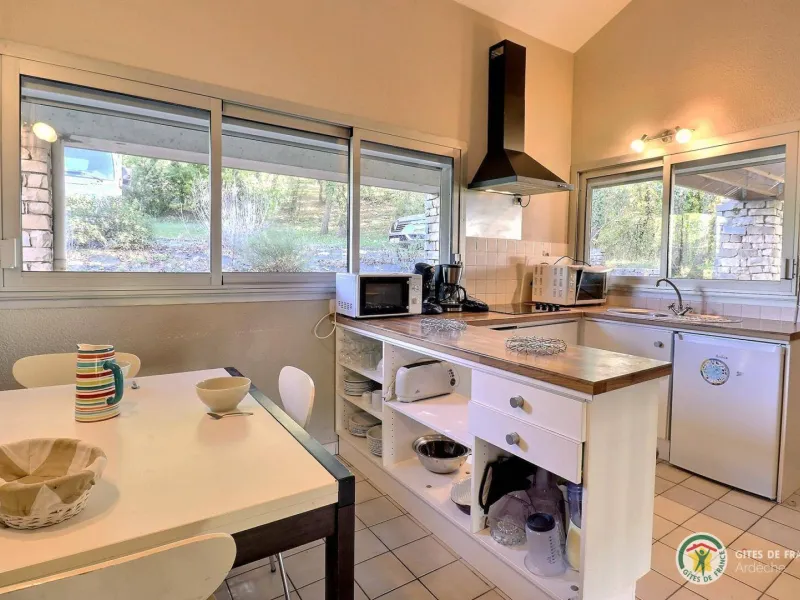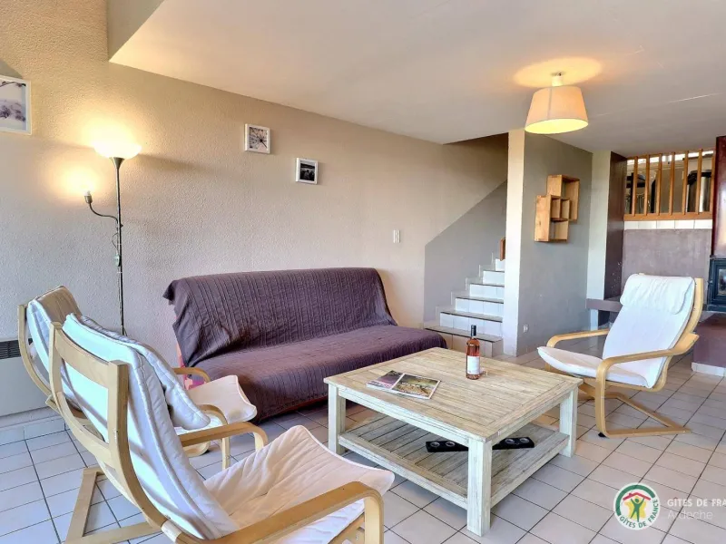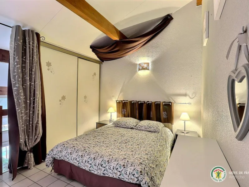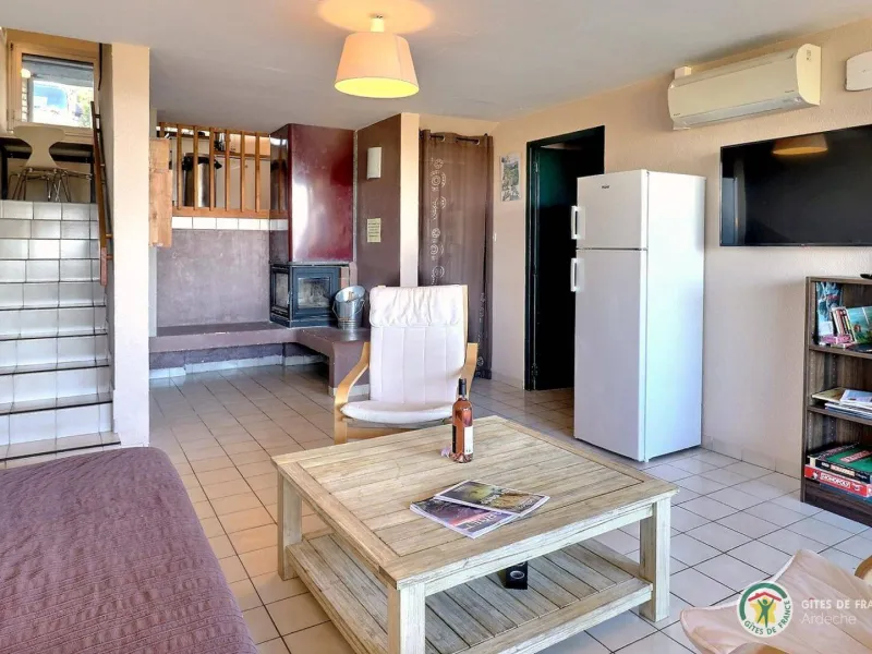 Living room (double sofa bed, wall-hung flat screen TV), fitted kitchen, mezzanine (double bed), 2 bedrooms (double bed) (2 single beds), bathroom, WC. Cot, high chair on request. Inset fireplace (free firewood), electric heating. Terrace, balcony, shared garden. Large shops 13km. Warm/cool air system. Covered swimming pool (4x9m) shared by 5 gîtes. Gîtes are 100m from waymarked hiking trail and about 3km from GR (long distance footpath). Towel hire: 3€/week/small towel, 5€/week/large towel.Localisation