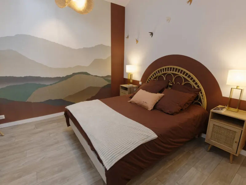C'est sur les hauteurs du village de Montferrier, côté jardin que se situe l'entrée de ce gîte. La carte de la modernité aux teintes méditerranéennes alterne avec le bois et les pierres apparentes du lieu.On admire ce contraste harmonieux contemporain du séjour et de l'escalier en acier, qui rejoint l'espace nuit plus traditionnel avec les poutres apparentes. Le plus, sont les prestations de service proposées par les propriétaires qui s'investissent pour faire revivre ce village à proximité du Château de Montségur et sur la route de la station de ski des Monts d'Olmes : cours de yoga, massage, repas.