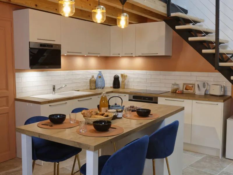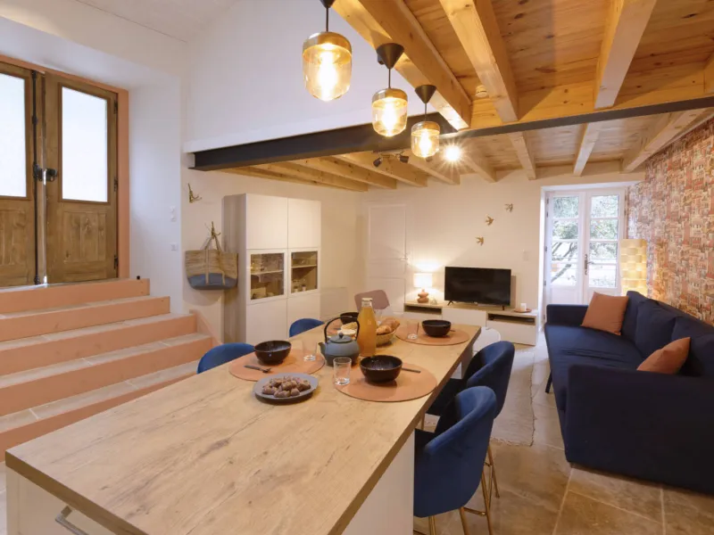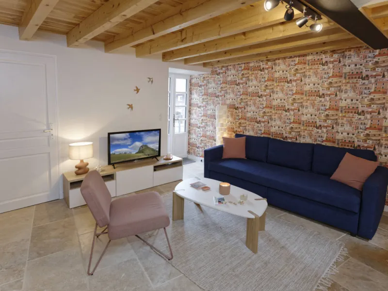 Rez-de-chaussée : Séjour avec Coin Cuisine intégrée et espace salon (téléviseur écran plat), accès Internet. WC avec lave-mains.