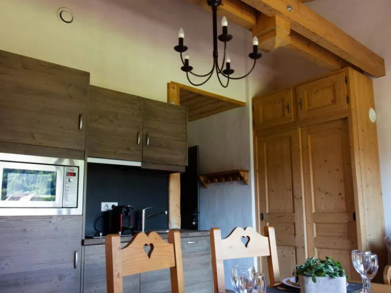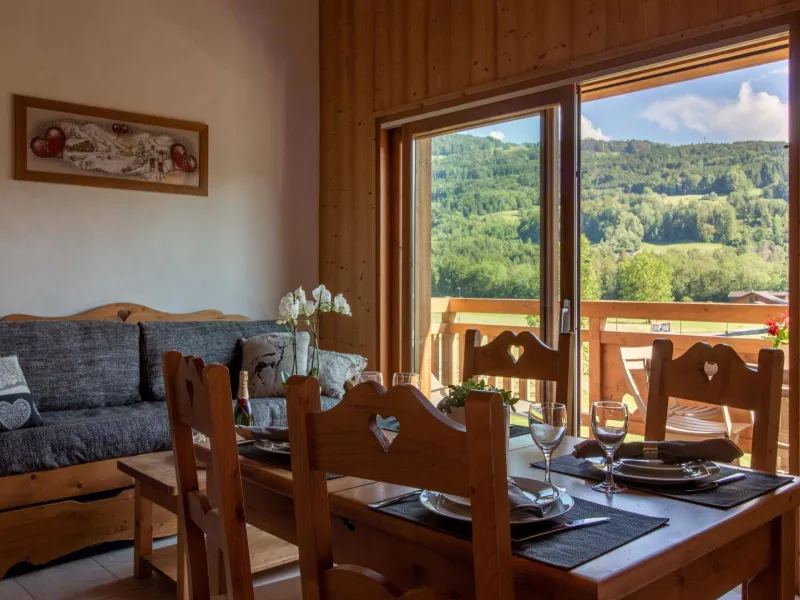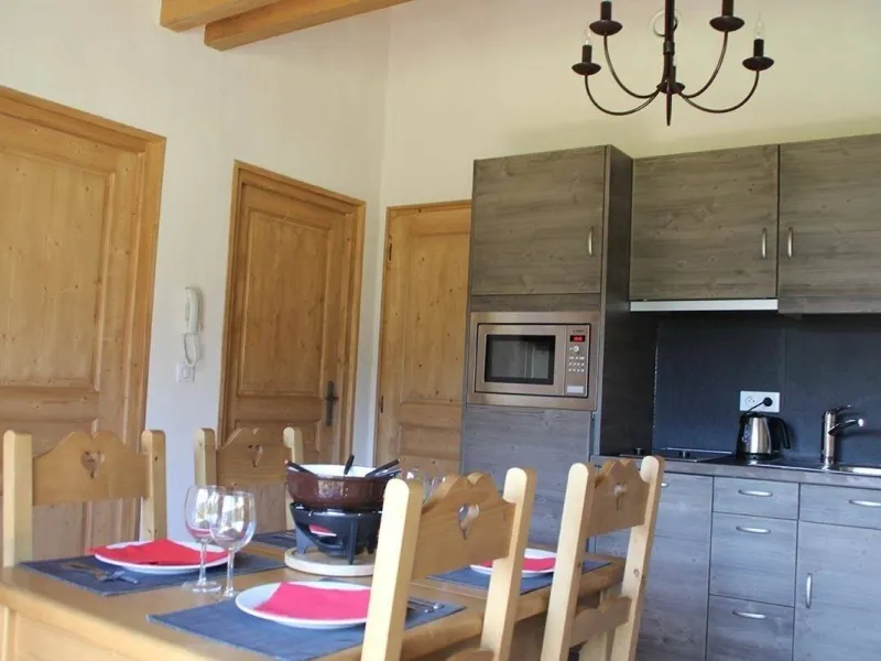 On-site facilities: indoor pool (34°C), Jacuzzi, fitness center, hammam, sauna, body treatments. In the Gite: fitted kitchen opening onto living room, Ch1 (1 bed 140), Ch2 (2 beds 90), shower room, WC. Balcony/terrace with furniture. Bed linen and towels provided, beds made. Shared ski room with washing machine. Parking. Breakfast available on site. Ski in Morillon 6km, Les Gets 12km, Samoëns 13km, Praz-de-Lys 14km. Taninges village center 800m away. Short-stay rates available (2-night minimum). Numerous hiking trails nearby.Localisation