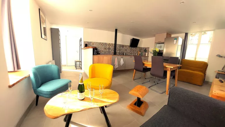 Modern, well-equipped and bright accommodation in the heart of Suisse Normande. Ideally located next to the Orne, the Vélo Francette (green route) and along the GR Tour de la Suisse Normande and the Loop du Hom. Close to the nautical base, town center and aquatic center, the accommodation comprises 2 bedrooms. One is equipped with a king-size bed that can be converted into 2 single beds, and the other with a 160x200 double bed. A convertible armchair in the living room converts into a comfortable bed. The shared courtyard has been designed for your relaxation. A secure bicycle garage, equipped with electrical outlets, is at your disposal.