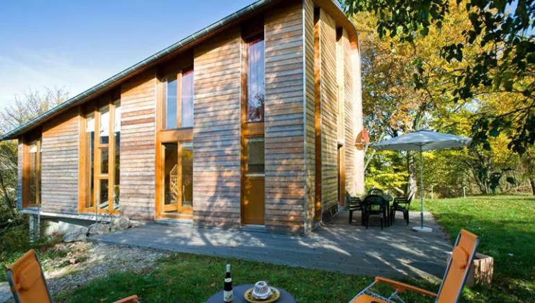 Contemporary, detached, original architect-designed wooden house.