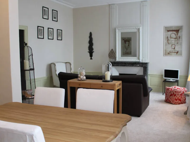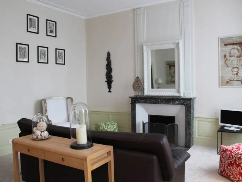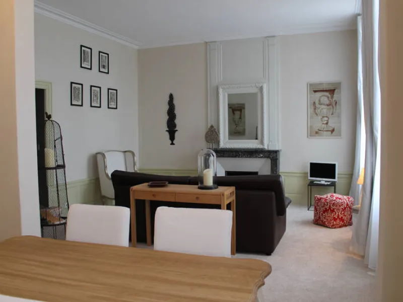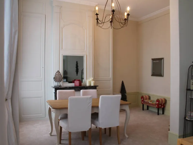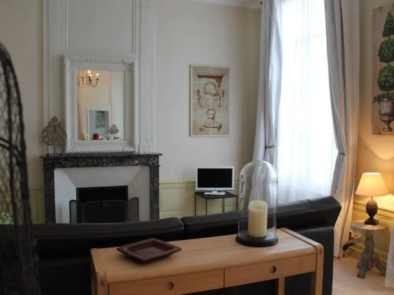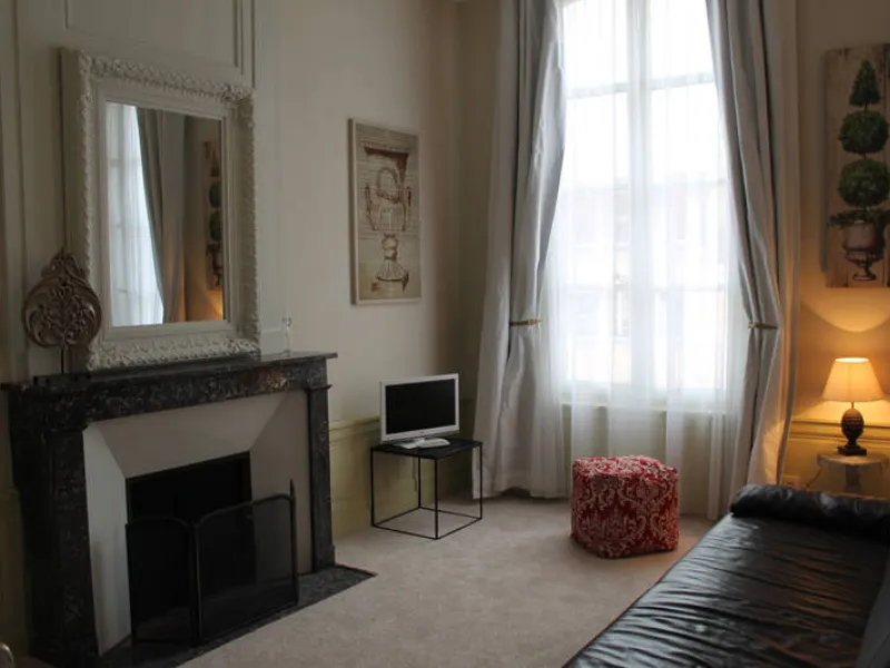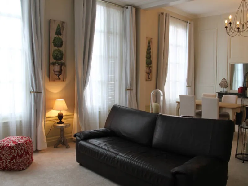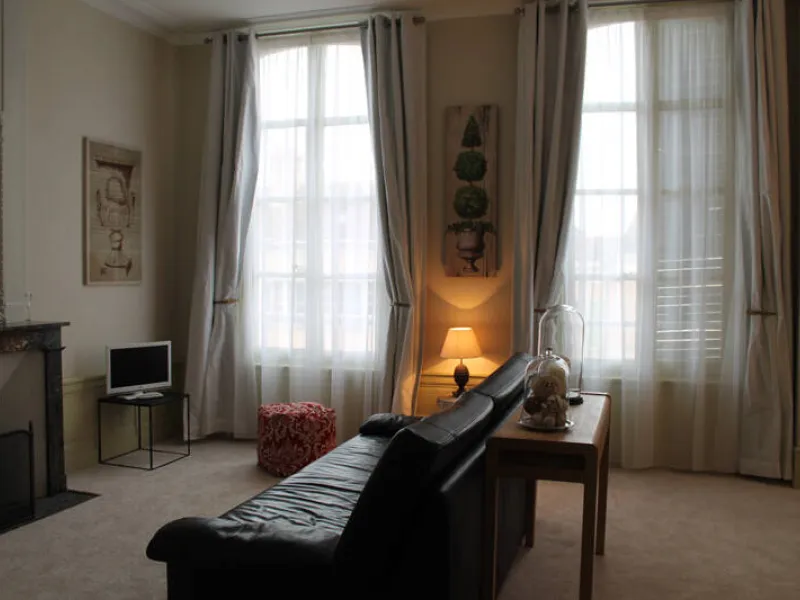 In the heart of the historic district, on the upper floors of a grand townhouse that was once home to the Bishopric of Chartres, are three delightfully-renovated furnished apartments for you to enjoy a restful stay. On the second floor, "Charles V" is a refined apartment of 80m², comprising a bedroom with a queen-size bed, a beautiful living room with sofa-bed, a shower room and toilet. The house boasts a refined yet warm, welcoming atmosphere. Equipped kitchen with a Nespresso machine. Internet. The stand-out asset of this address is the remarkable rustic-style garden with its delightful features. Private parking.Localisation