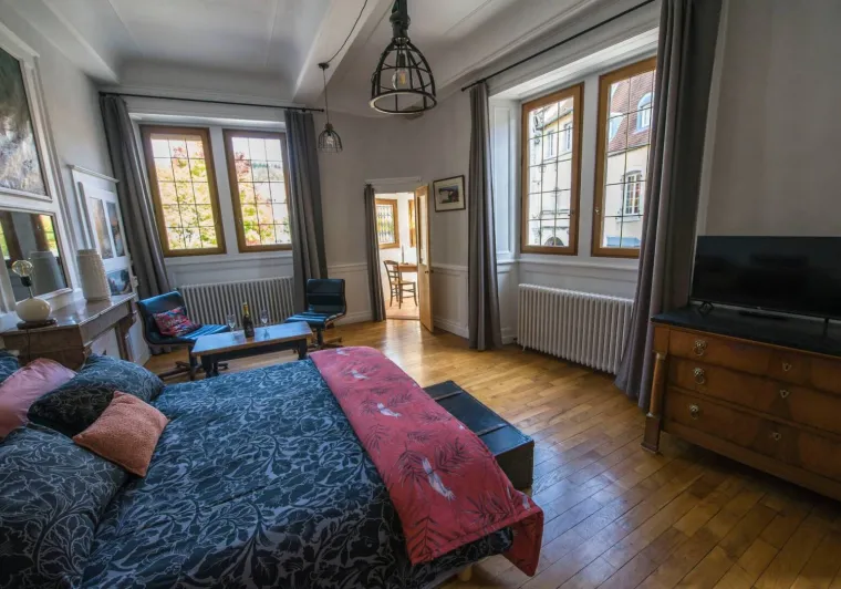 La suite Tourelle is a furnished tourist accommodation located in a house listed as a historic monument, "the house with the turret", so characteristic of Baume les Dames, right in the historic centre and close to the Tourist Office, shops and restaurants!This furnished apartment comprises a large bedroom with 1 double bed (160cm), 1 bedroom with 1 single bed (160cm), separate bathroom and wc. and 1 kitchenette. Tastefully decorated!