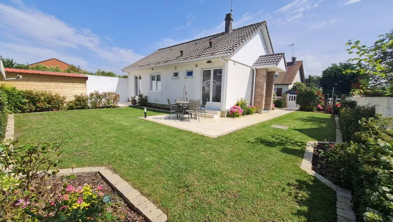 The gîte Ô de Caps is located 100 meters from the beach in Sangatte in the heart of the Grand Site des Deux Caps. This bright bungalow of 75m² is classified 3 stars and Accueil Vélo. It can accommodate up to 4 people: living room, fully equipped kitchen (oven, microwave, refrigerator, dishwasher, coffee maker...), two double bedrooms with queen-size beds, bathroom with Italian shower (90x120cm), independent toilets and laundry room. Two beautiful sunny terraces are located in the garden with trees and flowers.