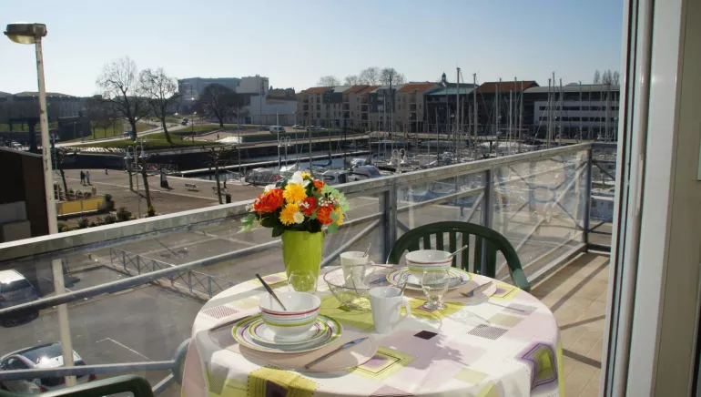 2nd floor flat of 43m² with lift , 2 rooms, kitchenette, bed-settee, (2 persons), equipped kitchenette,1 bedroom (king size bed), shower, balcony. Access for handicapped persons. Rates for persons attending the Spa Centre. Laundry room in the residence (washing-machine & dryer). Public parking nearby. At an angle view over the pleasure port.
