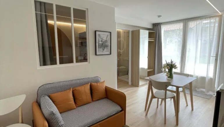 This 26m² studio is on the ground floor, ideally located in the center of Cognac. As the owners are architects, the decoration, fittings and materials have been chosen with the greatest care. This studio is the only one of our six that benefits from an independent bedroom.