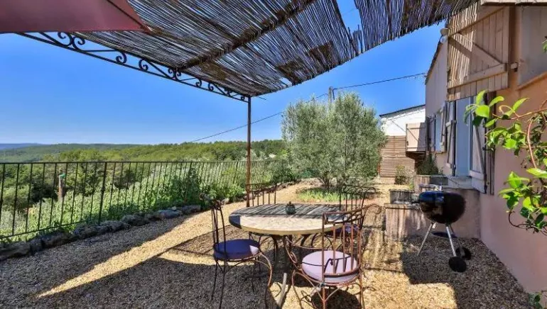 Sur la terrasse, il y a une table avec quatre chaises, deux chaises longues, un coin ombragé et un barbecue.