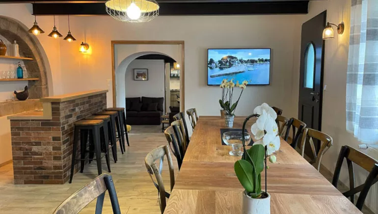 The accommodation can sleep up to 17 people. It has 7 bedrooms, one of which is wheelchair accessible, 11 beds, 3 bathrooms and a shower room, 5 WCs, a large living/dining room and a fully equipped kitchen (dishwasher). You can also make the most of the terrace in fine weather, with barbecue, garden table and garden furniture.