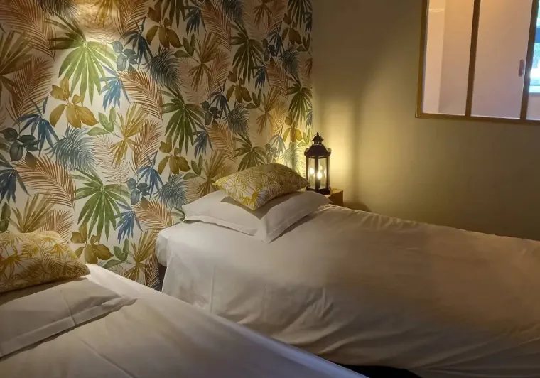 1 pièce principale (cuisine et espace repas), couloir desservant wc et SDB et grande chambre lumineuse, donnant sur le jardin. Possibilité lit bébé/lit enfant.Jardin commun à l'arrière du bâtiment (passer par l'extérieur pour y accéder), au bord du Sioulot, au milieu des arbres fruitiers (salon de jardin).