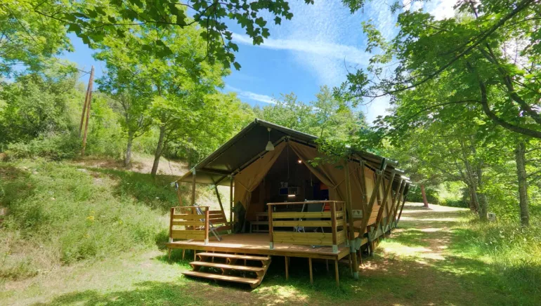 Nos tentes Safari Lodge (Mezenc et Gerbier) sont installées sur un domaine arboré de 2,5 hectares au sein d'un petit camping d'une quinzaine d'emplacements.