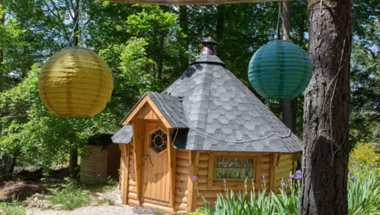 Kota finlandais 12 m2 : chalet octogonal composé d'une chambre. Toilettes sèches privatives à proximité du kota