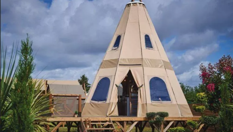 Come and discover the Tipi tent at Domaine du Roc! Relive your childhood dreams in this unusual accommodation, equipped just like home. You will find a fully equipped kitchenette, an adult bedroom and a children's bedroom upstairs, as well as a bathroom with a shower, washbasin and toilet. You can also enjoy the campsite's facilities (heated indoor swimming pool, entertainment, bike, canoe, pedalo and tree-top adventure hire). Overnight stays are available outside July and August.