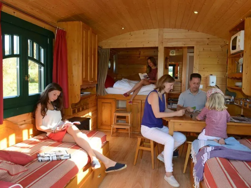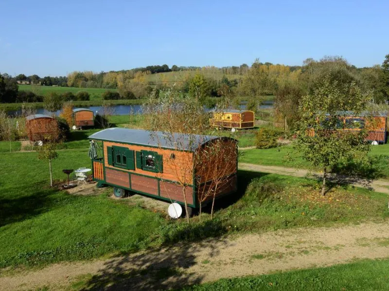In Anjou Bleu, on the banks of the Mayenne river, the Roulottes & Cottages du Moulin offer a complete change of scenery in the heart of nature, in an unusual and unusual setting in the heart of a cultural region steeped in history and rich in local produce. Nine trailers for 2 to 5 people (with one double bed and three single beds) and one accessible to people with reduced mobility for 2 to 3 people with kitchenette, shower room, WC, barbecue, garden furniture, parasol, deckchairs, electric heating and TV. Seven fully-equipped cottages, including three for 4 to 8 people, four for 2 to 6 people and one bedroom for 2 people (no kitchen).A range of on-site activities are available, including a wellness area with jacuzzi and sauna. The Domaine also has a heated indoor swimming pool. The team will be delighted to offer you a relaxing massage. You can also come aboard the Hirondelle for boat cruises.
