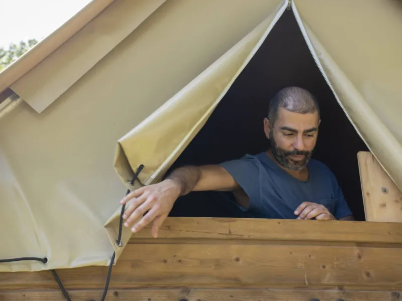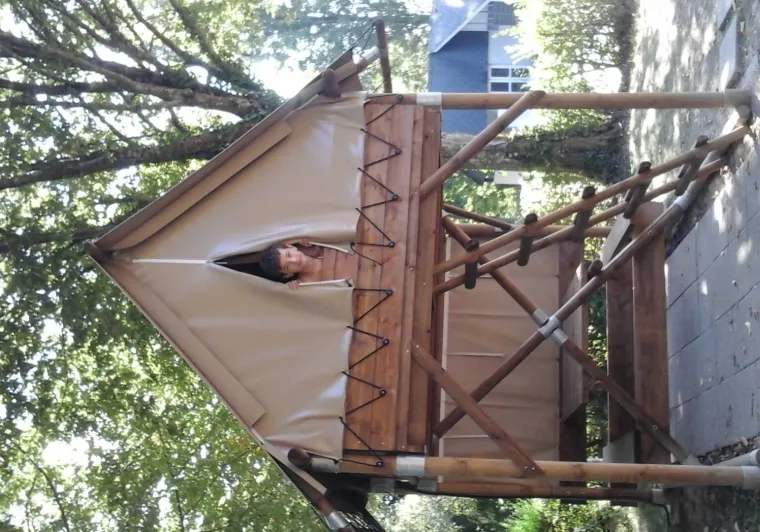Three bivouac tents have been installed at the Gué Saint-Léonard campsite. This improved hut has a wooden structure and a strong canvas roof. This type of light accommodation (5 m²) sleeps 2 people. They are equipped with 2 single mattresses and 2 power sockets.A picnic table at the foot of the tent lets you enjoy the outdoors while being sheltered from the rain.