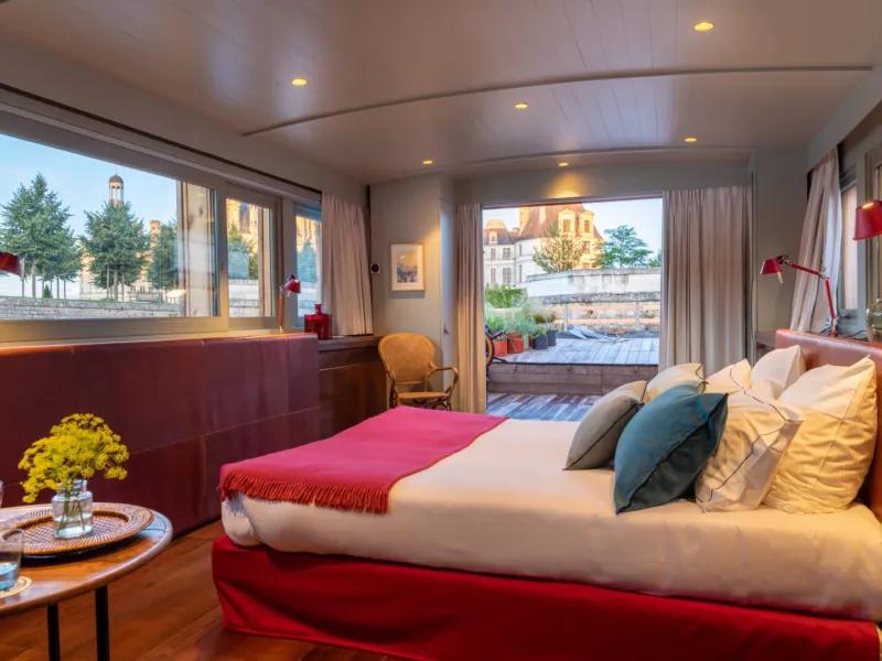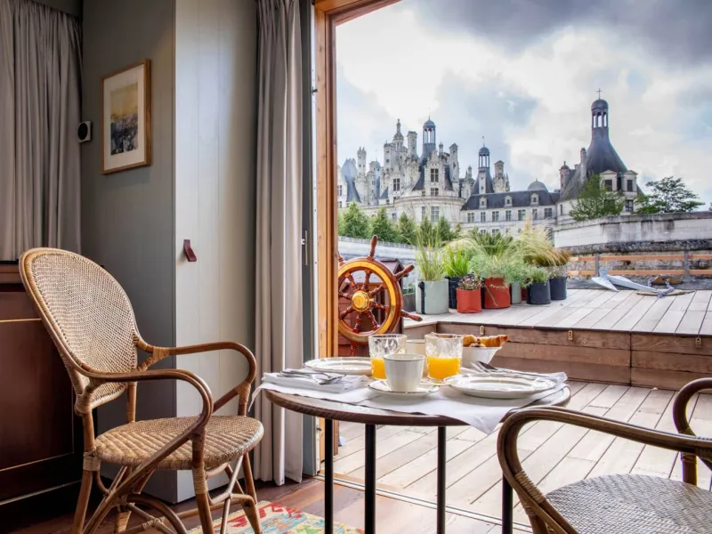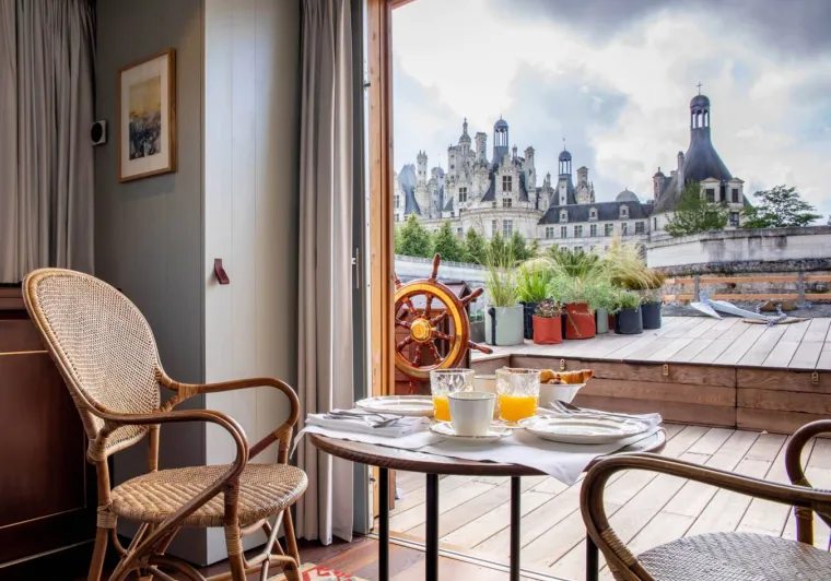 Our private suite floats on the Cosson canal? Discover our atypical room with the Château de Chambord in the background. Book a magical night aboard the Toue du Relais, a traditional flat-bottomed Loire boat, converted into a luxury suite for two.Localisation