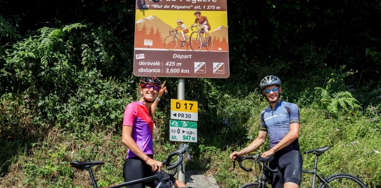 Au départ de Foix, vous remontez à bicyclette le cours de l’Ariège par sa rive gauche jusqu’aux portes de Tarascon-sur-Ariège. Une première grimpée vous hisse vers le Col de Port avant de prendre la direction du point culminant : Péguère ; où certaines portions atteignent 18 % de pente ! Grimpé initialement par le Tour de France en 2012, il mérite son surnom de “mur”. Là-haut, faites une pause pour admirer l’un des plus beaux panoramas sur les Pyrénées, avant de rentrer sur Foix par le Col des Marrous et finir en beauté par la bucolique vallée de la Barguillère.