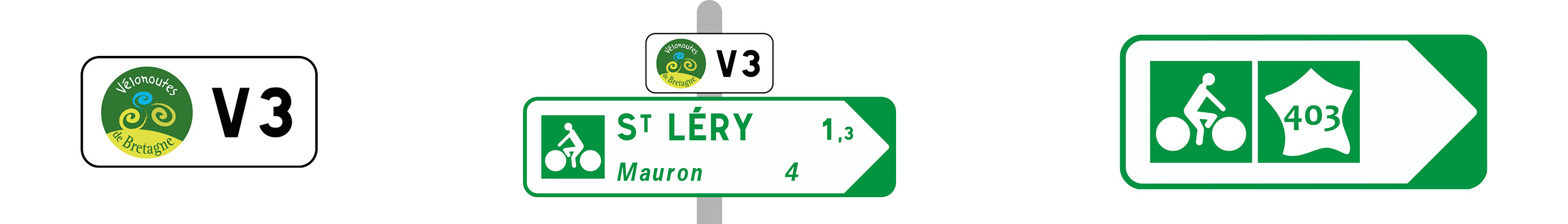 The Voie 3 Bretagne cycle route from Saint-Malo to the Rhuys Peninsula is fully signposted in both directions, from north to south. Its regional code, V403, is gradually being added to the signs. You may occasionally come across signs marked V3.
