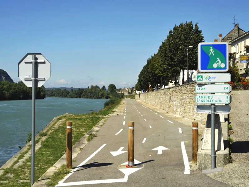 This ViaRhôna stage takes you through unspoilt countryside beside the Rhône. Hidden in the magnificent landscapes of the southern Bugey, with their mountains and forests, lie splendid lakes and marshes. You pass lovely villages like Saint-Sorlin-en-Bugey and Sault-Brénaz, and the more secretive La Balme-les-Grottes, with its great caves and picturesque centre. A lovely greenway links "La Vallée Bleue" to Lagnieu. At Lagnieu Bridge, follow the D 1075 and D 65 to join La-Balme-les-Grottes, Be careful on the road (no signposting).