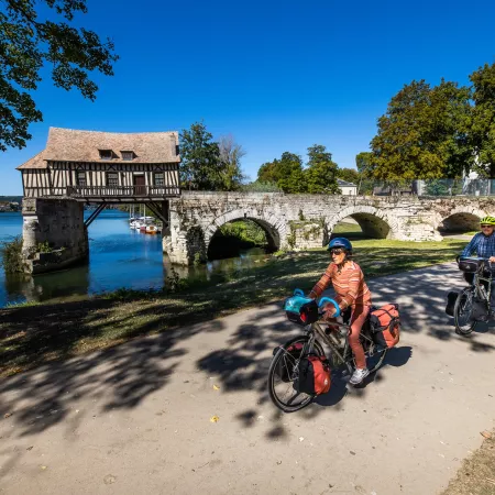 Cyclistes en voyage devant le vieux Moulin à colombage de Vernon © David Darrault - La Seine à Vélo