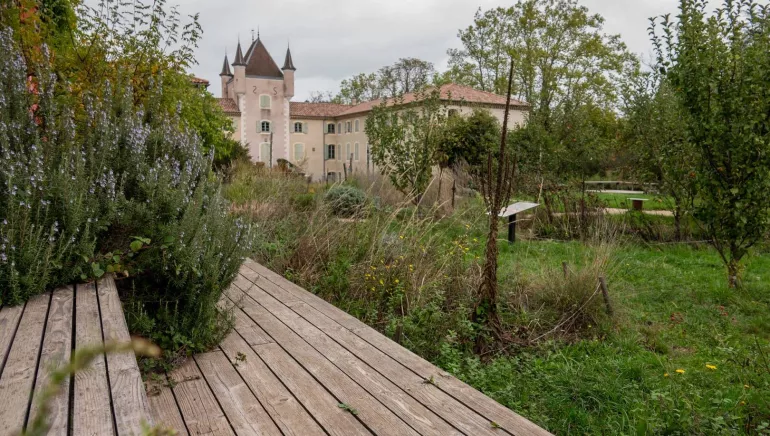 It covers an area of 30 hectares and includes several natural environments: patches of tall grass and flowers, large expanses of meadow, trees and shrubs, hedges, dead wood, vegetable gardens, water sources and short lawns. The garden is a ‘showcase’ space that serves as an educational tool for discovering local nature and examples of simple landscaping.